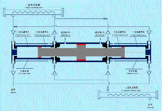 下圖是油氣缸分開(kāi)式液壓壓縮缸的示意圖(圖中未畫出液壓部份,液壓系統(tǒng)與立式液壓壓縮機(jī)類似);