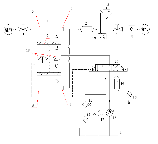 上圖是立式液壓壓縮機(jī)的工作原理圖,其中,實(shí)線部分為氣路和液路,虛線部分為控制線路。1 球閥、2 冷卻器、3 安全閥、4 球閥、5 單向閥、6 進(jìn)氣閥、7 排氣閥、8 氣缸、9 活塞、10 蓄能器、11 回油過(guò)濾器、12 油冷卻器、13 液壓泵、14 油箱、15 電液換向閥、16 限位開(kāi)關(guān)、17溢流閥、18壓力表、19壓力傳感器。