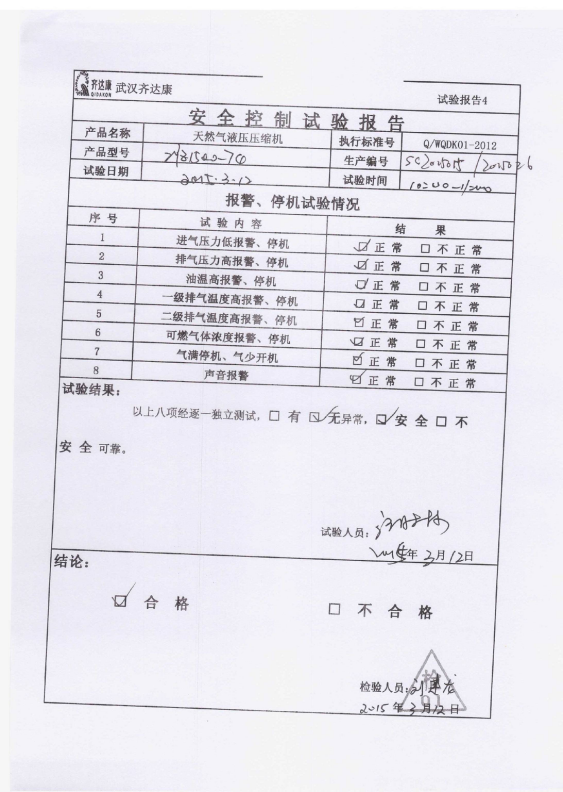 4、安全性試驗(yàn) 機(jī)組安裝調(diào)試后,即做安全性試驗(yàn),試驗(yàn)內(nèi)容如下:壓力報警停機(jī)試驗(yàn)、溫度報警停機(jī)試驗(yàn)、可燃?xì)怏w濃度報警停機(jī)試驗(yàn)、事故緊急停機(jī)試驗(yàn)、安全閥緊急放散試驗(yàn)。