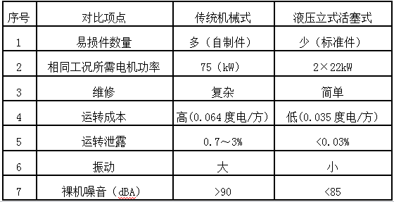 綜上所述,齊達(dá)康公司提供的立式活塞式液壓壓縮機(jī)與老壓縮機(jī)相比,具有較多的優(yōu)勢,我們所選用的設(shè)備是有成效的。以下是齊達(dá)康公司將立式活塞式液壓壓縮機(jī)與傳統(tǒng)壓縮機(jī)所作的比較: